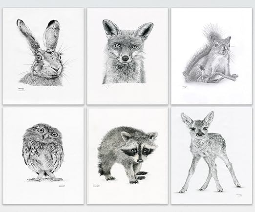 Nursery Set De 6 Animales Arte Dibujo A Lapiz Art Prints Fox Ciervo Liebre Racoon Ardilla Buho Amazon Es Hogar