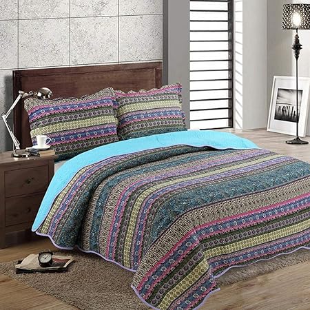Couvre Lit 100 Coton 3 Pieces Exotique Boho Matelasse Patchwork Couette Boutis King Size National Wind Stripe Couvertures Literie Avec Taie D Oreiller Decoratif Blue 230x250cmx1 48 73cmx2 Amazon Fr Cuisine Maison