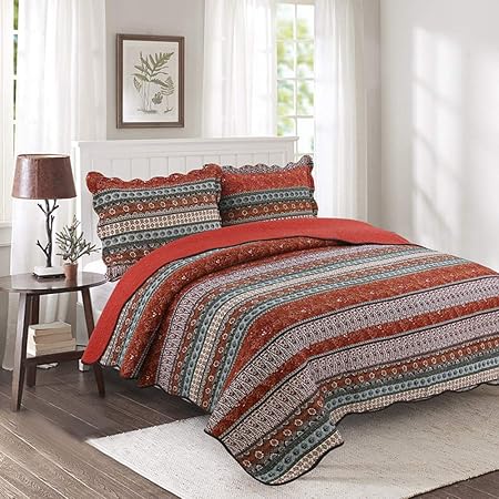 Couvre Lit 100 Coton 3 Pieces Exotique Boho Matelasse Patchwork Couette Boutis King Size National Wind Stripe Couvertures Literie Avec Taie D Oreiller Decoratif Red 230x250cmx1 48 73cmx2 Amazon Fr Cuisine Maison