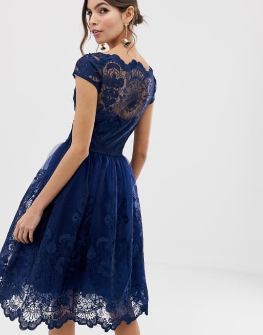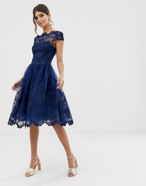 Buy Chi Chi London Petite Premium Lace Midi Prom Dress With Bardot Neck Blue At Goxip