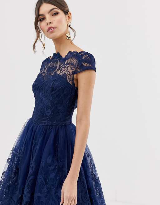 Chi Chi London Bardot Chi Chi London Petite Premium Lace Dress Cutwork Detail And Cap Sleeve Navy Women Chi Chi London Ballkleid Navy Silver Chi Chi London High Neck Lace Midi Dress Colorful