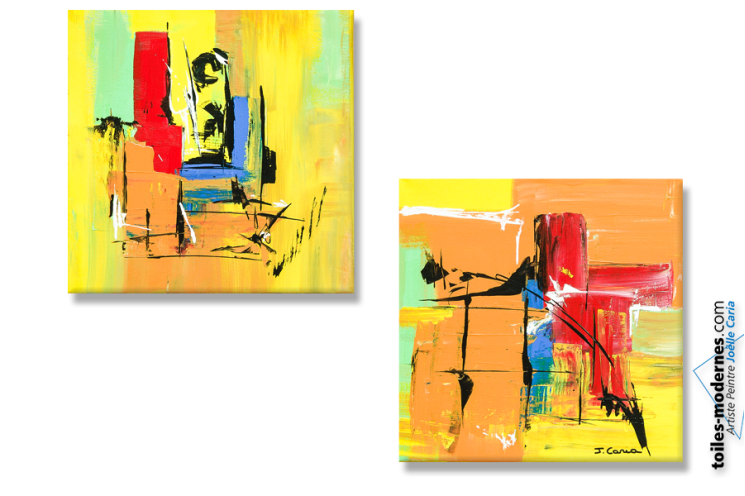 Diptyque abstrait jaune orange deux tableaux carrés peinture acrylique authentique moins de 40 euros
