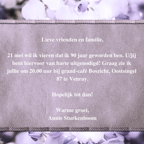 verjaardagskaart voor 90e verjaardag met paarse bloemen